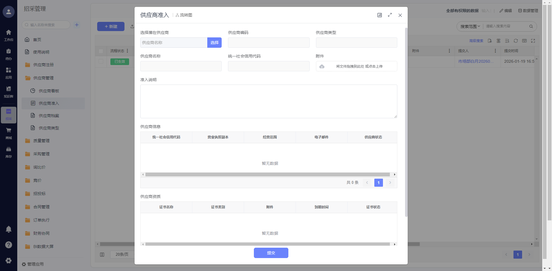 识别、实名认证与企业关联验证。审核环节支持自动比对第三方征信信息,校验工商状态,异常状态自动拦截;准入过程中可发起调查表、供应商评审与物料认证,形成完整的准入档案,确保供应商资质合规与供货能力达标。