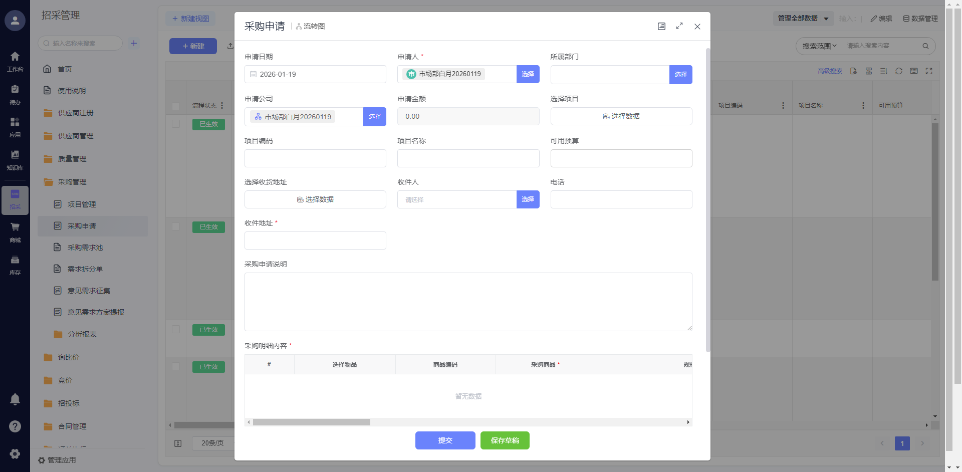 系统数据;申请提交时可进行预算校验与合理性判断(关联历史价格、库存状态),确保需求合规;审核流程可按申购人、物料类型自定义配置,支持退回留痕与变更通知。