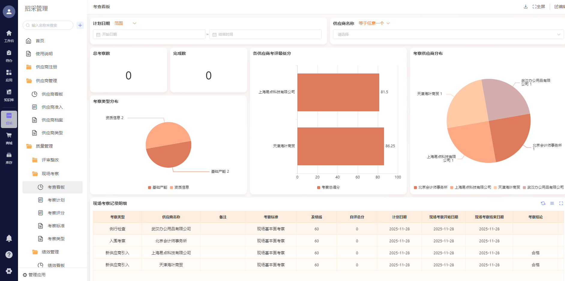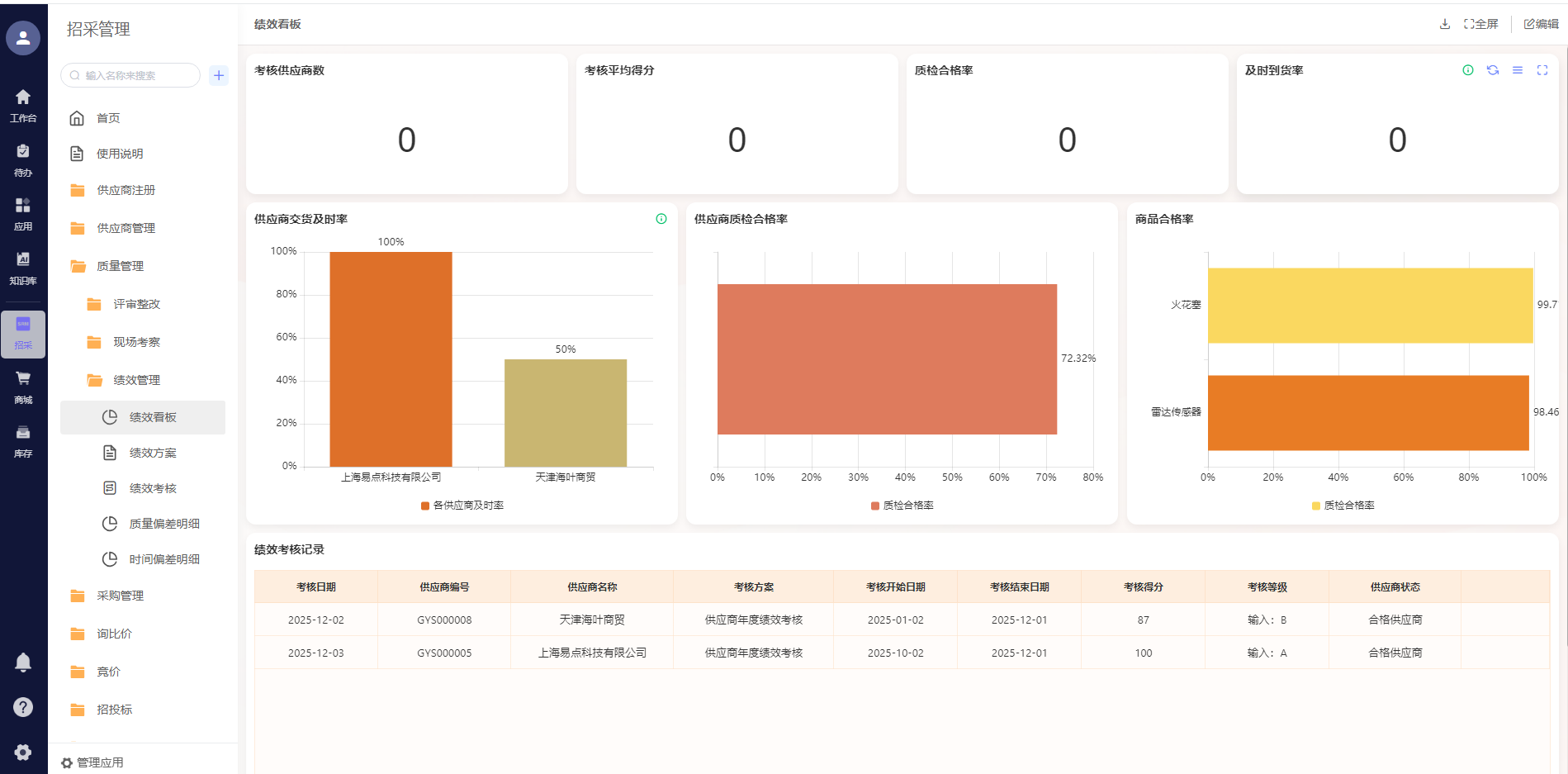 系统自动记录供应商资质信息,设置资质到期提醒,提前30天推送预警通知,避免因资质过期导致的合作风险;实时抓取采购订单执行数据,当出现交付延迟、质量不合格等情况时,系统自动触发预警,助力企业及时与供应商沟通协调,调整采购计划;整合历史采购价格数据,形成价格数据库,当新采购价格超出合理波动范围时,自动提醒采购人员核查,规避高价采购风险。同时,系统生成多维度采购数据报表——供应商准入报表、订单执行报表、绩效评估报表等,为企业采购决策提供精准的数据支撑,帮助企业优化供应商结构,提升供应链抗风险能力。