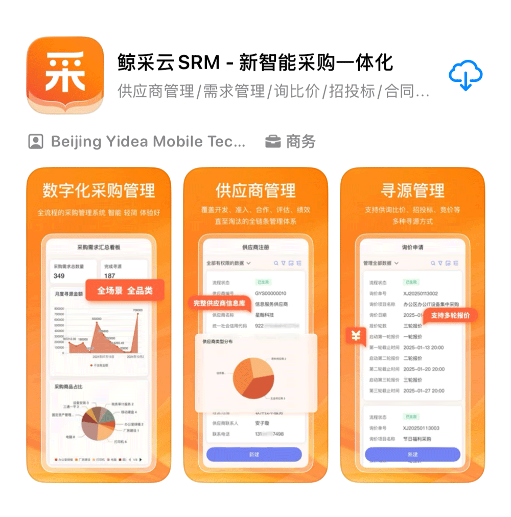 在企业采购管理场景中,信息不对称、流程繁琐、供应商管理松散、成本难把控等问题,往往制约着供应链效率提升。传统采购模式依赖人工记录、线下沟通,不仅耗时耗力,还易出现数据误差、责任追溯难等隐患。鲸采云SRM系统,作为新一代灵活自定义的SRM系统,以数字化手段打通采购全流程,破解企业采购管理痛点,实现供应商关系精细化管理与采购价值最大化。