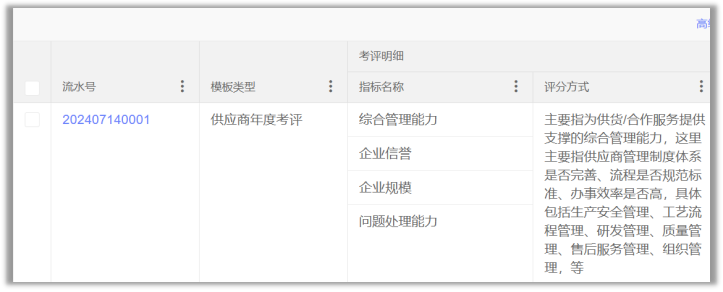 - 数据化绩效评估:制定多维度考核标准,涵盖质量、交期、价格、服务等核心指标,针对不同供应商定制专属考评模板,支持模板复用与关联考评。考核流程由多部门协同参与打分,系统自动汇总考核结果,生成供应商绩效分数与等级,数据驱动供应商优胜劣汰,推动合作质量持续提升。