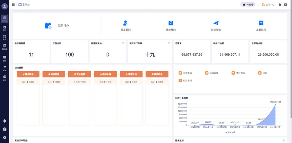 1. 采购效率大幅提升:分标段招标与电子化寻源流程,使大型项目采购周期缩短 40%;供应商在线协同接单、发货、对账,跨区域沟通成本降低 50%,订单响应效率提升 60%。