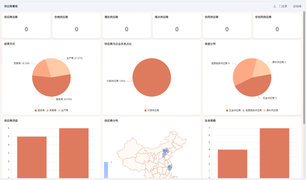 3. 数据驱动绩效考评:制定标准化供应商质量管理模板,根据履约及时率、供货质量、服务响应等核心指标自动考评,形成优胜劣汰机制;供应商看板实时展示分布情况、状态统计、绩效排名等核心数据,为合作决策提供依据。