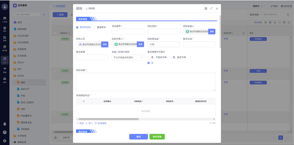 3. 招标流程合规闭环:支持邀标、答疑、报名、投标、评标、开标、二轮报价等全流程管理;评标规则模板化配置,自动生成评标单并推送至评标人,开标过程在线解密公示,二轮报价优化议价空间,确保招标过程公开公平公正。