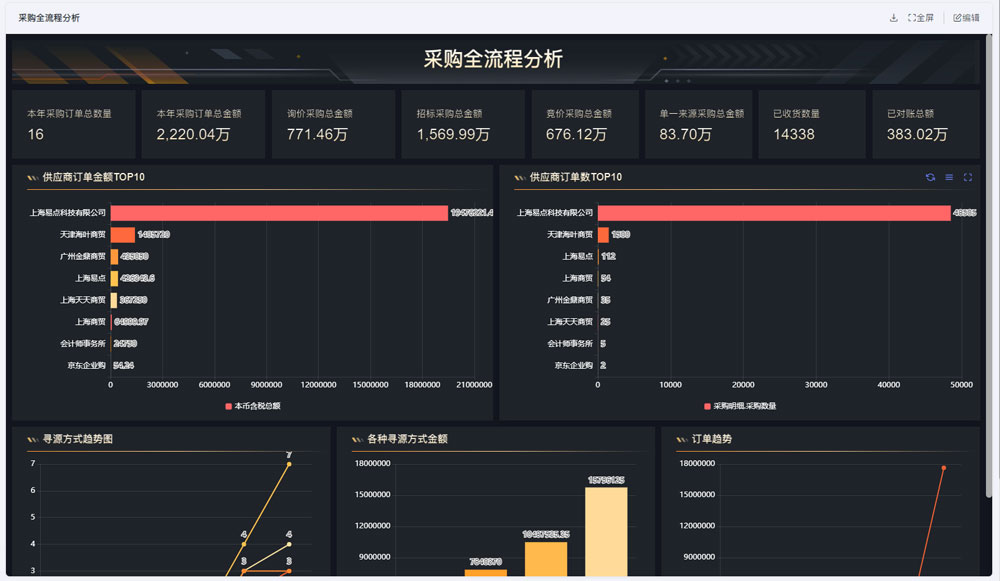 5. 数据可视化与决策支撑不足:采购全流程数据分散在不同环节,缺乏统一的 BI 分析平台,采购成本、供应商绩效、订单进度等核心指标无法直观呈现。