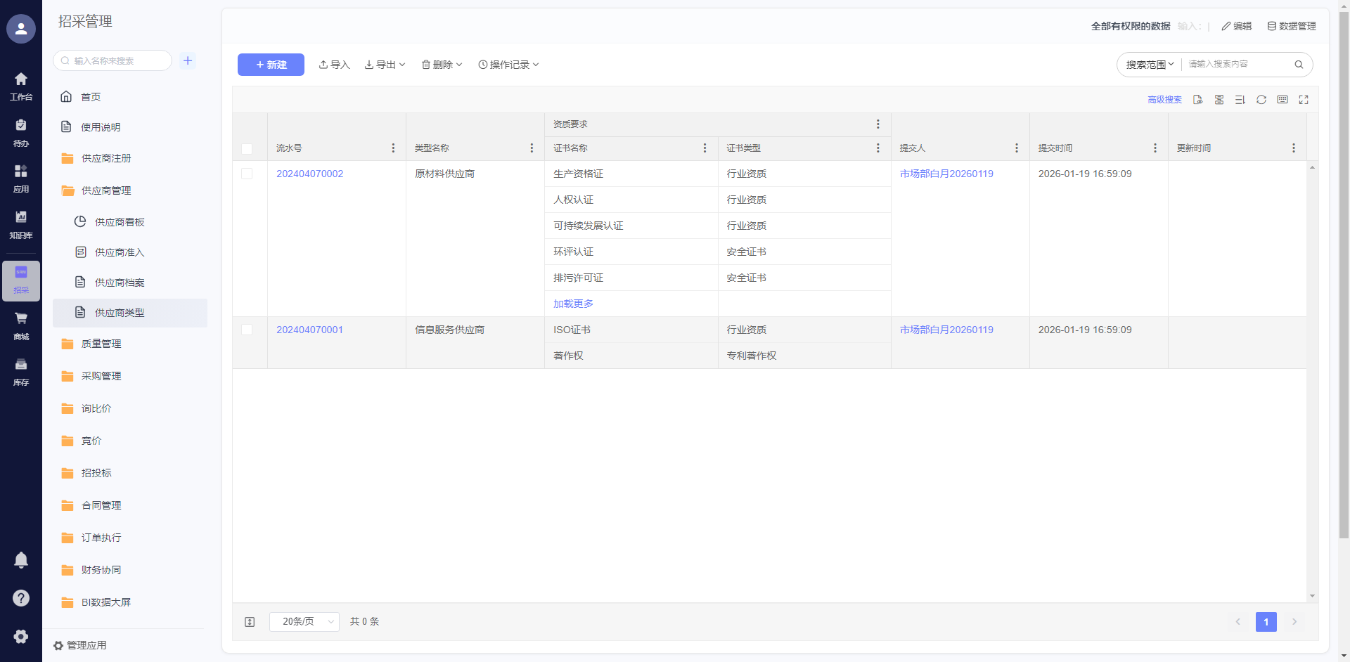 识别、实名认证与企业关联验证。审核环节支持自动比对第三方征信信息,校验工商状态,异常状态自动拦截;准入过程中可发起调查表、供应商评审与物料认证,形成完整的准入档案,确保供应商资质合规与供货能力达标。