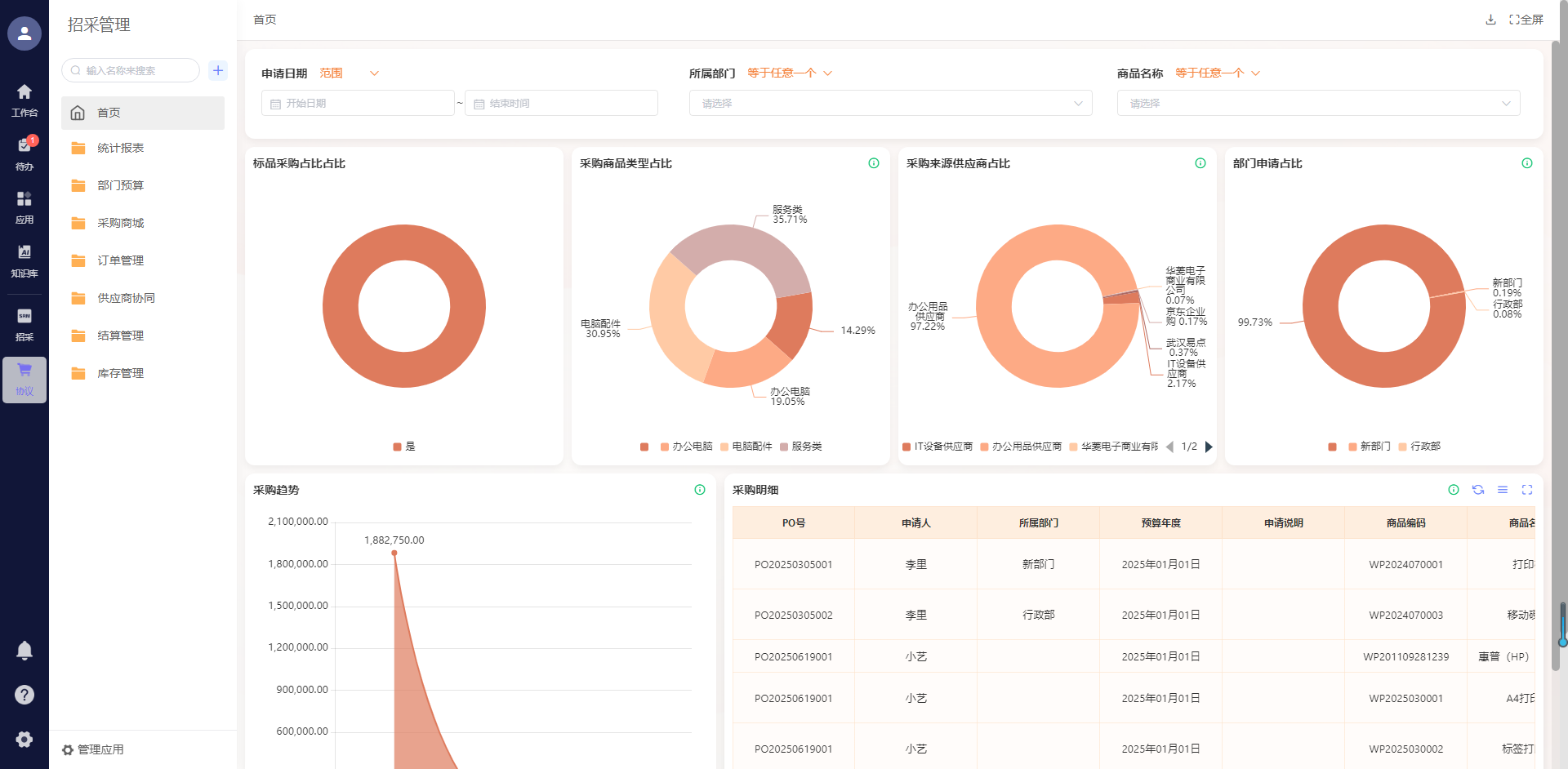 - 自动数据统计:实时统计采购核心数据,包括采购支出(按部门、按物料类型)、供应商履约情况(交付准时率、合格率)、流程效率(需求审批时长、订单处理时长),无需人工手动统计;