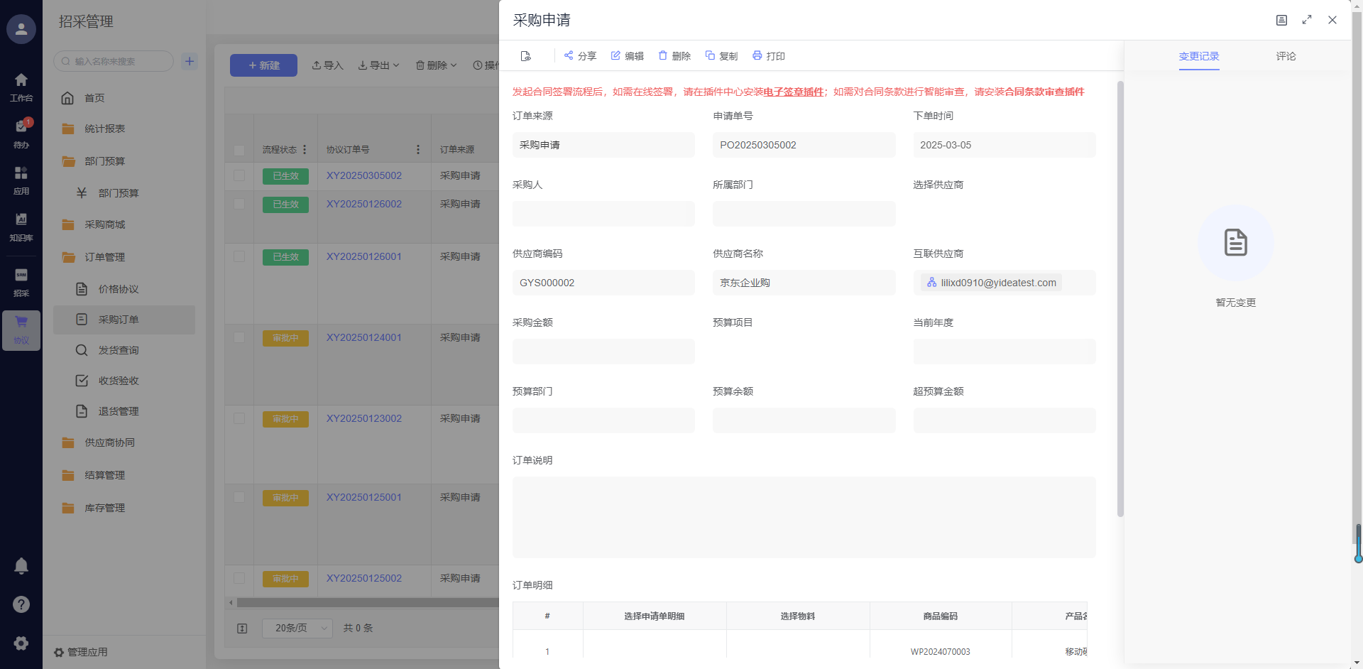 - 基础功能模块(适配小微企业):包含需求提报、简单询价、订单管理、供应商档案管理,满足小微企业 "流程线上化、信息不混乱" 的基础需求,帮助企业摆脱 Excel 手动记录的低效模式;