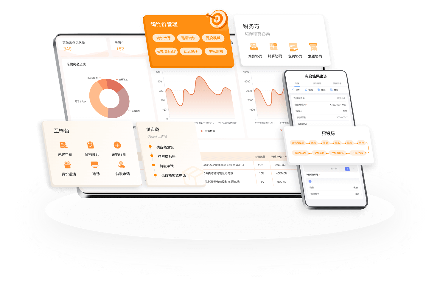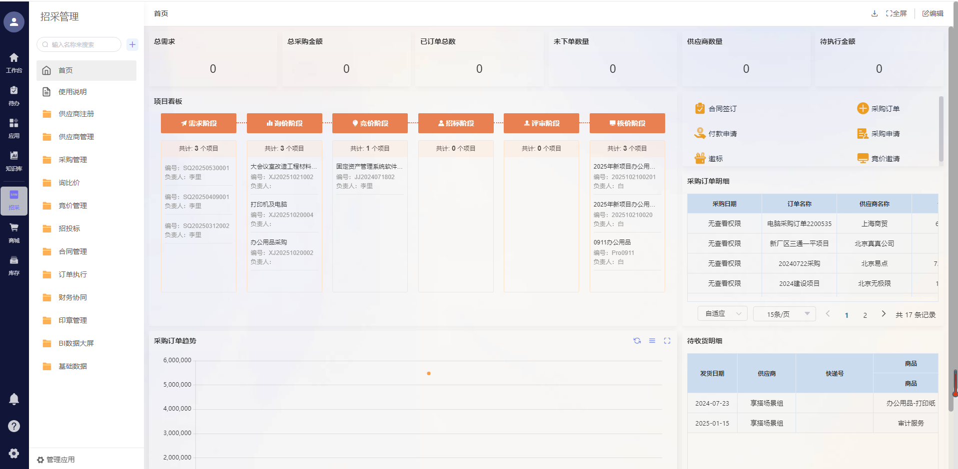 - 报表查看:管理员及采购负责人通过"数据中心"模块,查看采购全流程数据报表,掌握采购效率、成本控制等情况。