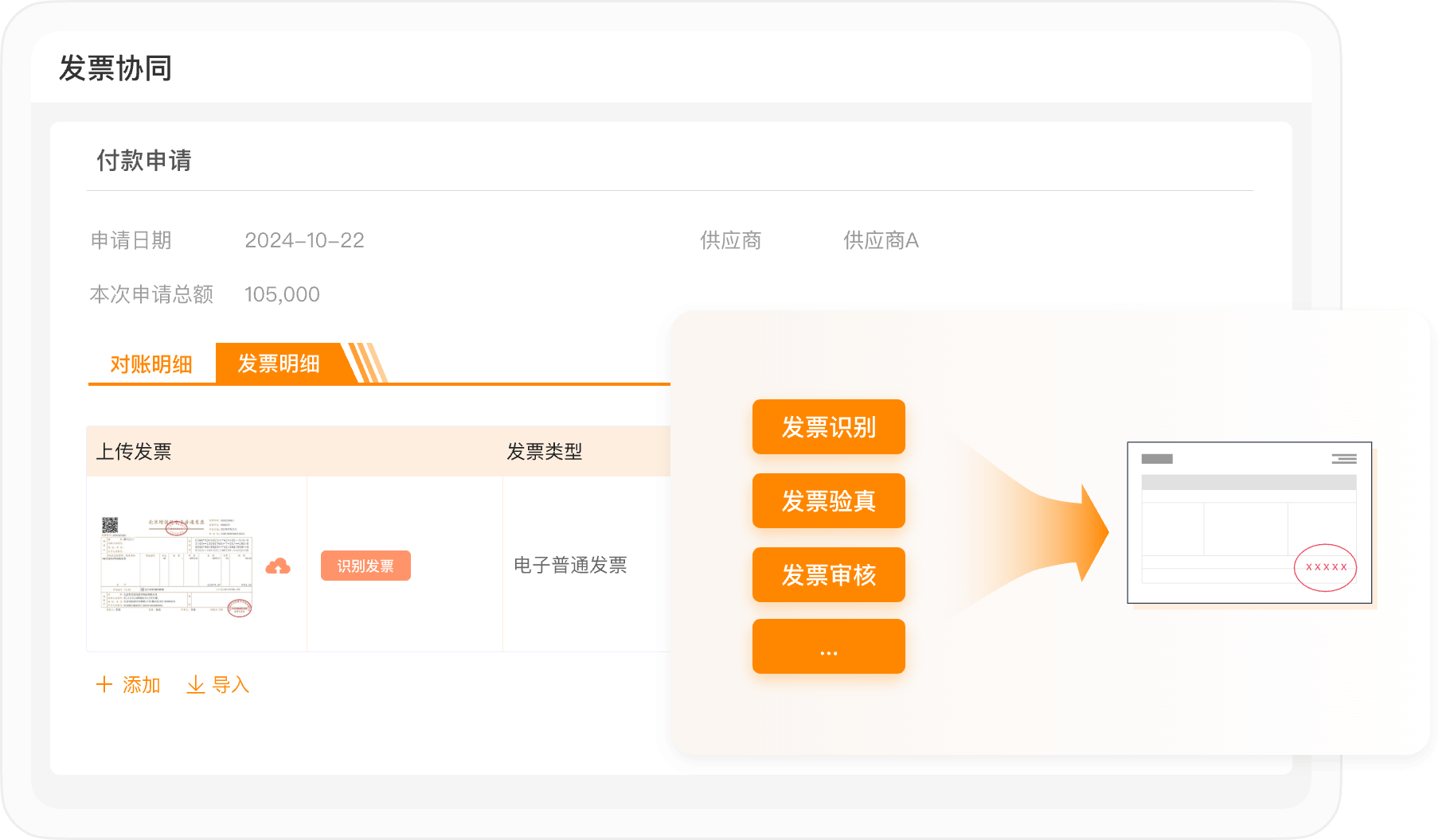 核心价值:实现发票与订单、收货单的自动匹配校验,减少人工审核误差,加快付款流程,避免财务风险。