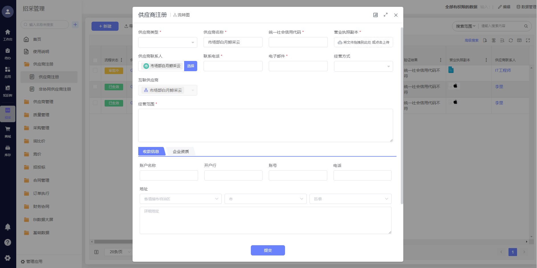 搭建统一的供应商管理模块,支持供应商注册信息自动校验、系统内信息匹配与条件分支流转,实现供应商从注册、审核到合作全流程的规范化管理,保障供应商信息的准确性与完整性。