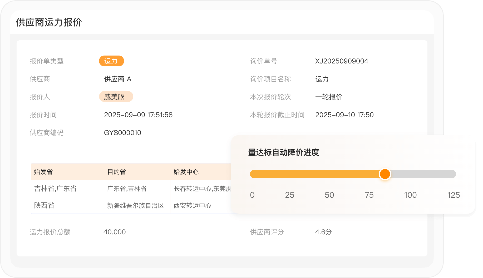 搭建标准化报价模块,支持供应商在线报不同路线 / 车型价格,系统自动比价选最优。